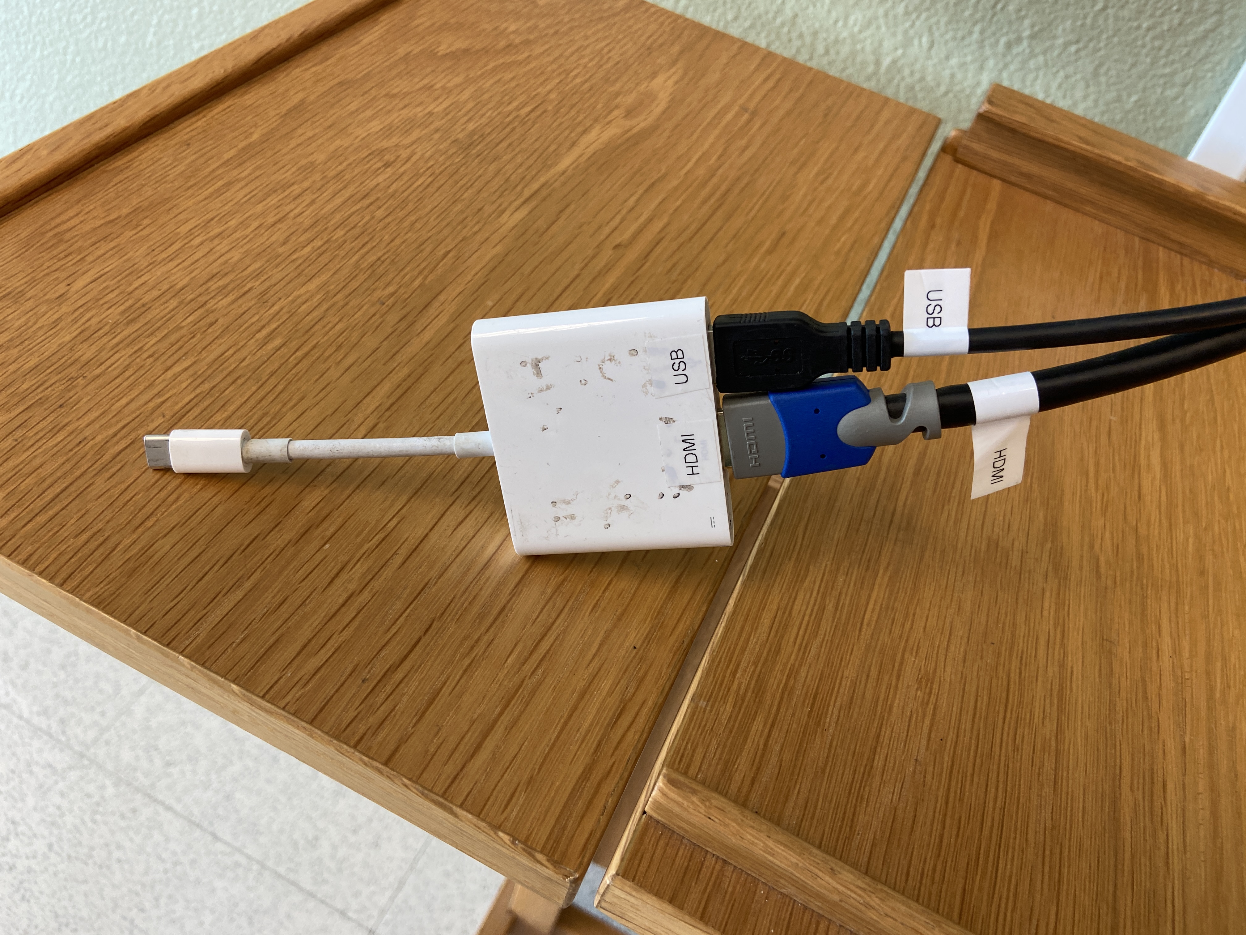 A usb-c to HDMI adapter is provided in the room. Older computers without USB-C and without HDMI built-in can check out an adapter from Academic Technology in LIB 80. |