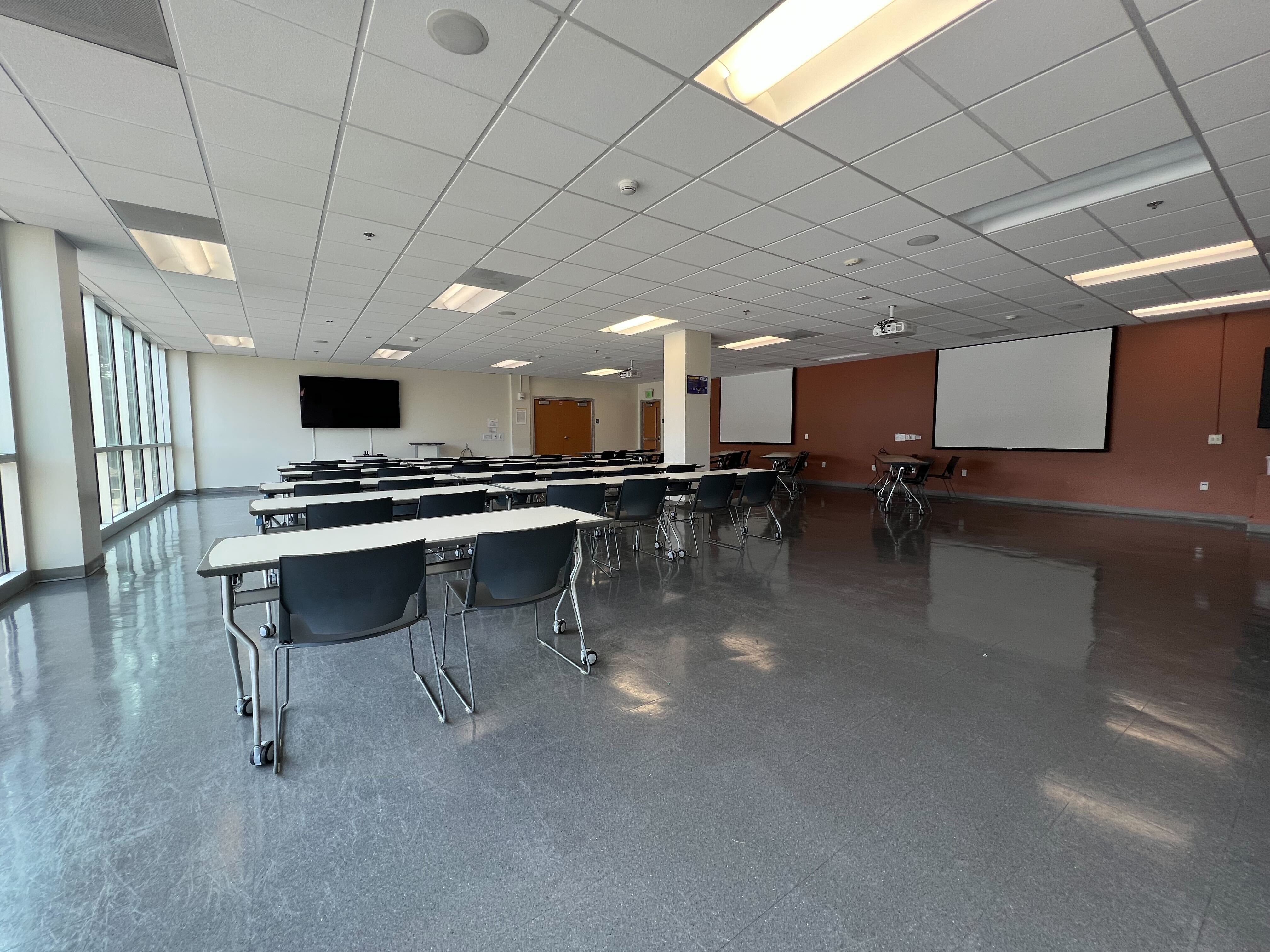 The library events room (LIB 121) is equipped with a flat panel television at the front of the room and two projectors at the side of the room. By default, all three displays show the same thing but can be used independently if needed. The flat panel television is the primary display and should be the display used if only one display is needed as all of the room controls are tied to this display.