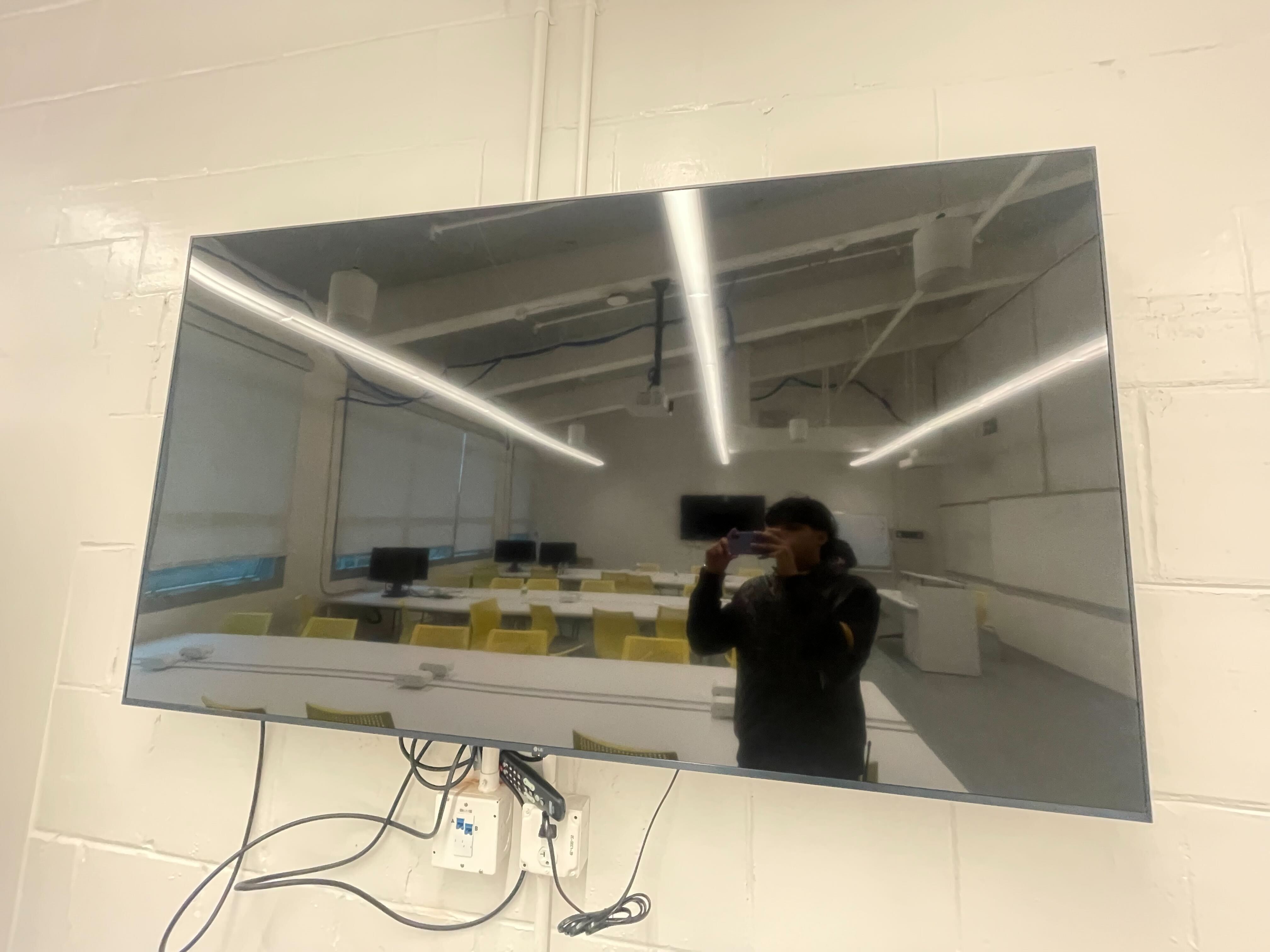 In this room you can connect your computer via HDMI. A usb-c to HDMI adapter is provided in the room. Older computers without USB-C and without HDMI built-in can check out an adapter from Academic Technology in LIB 80.